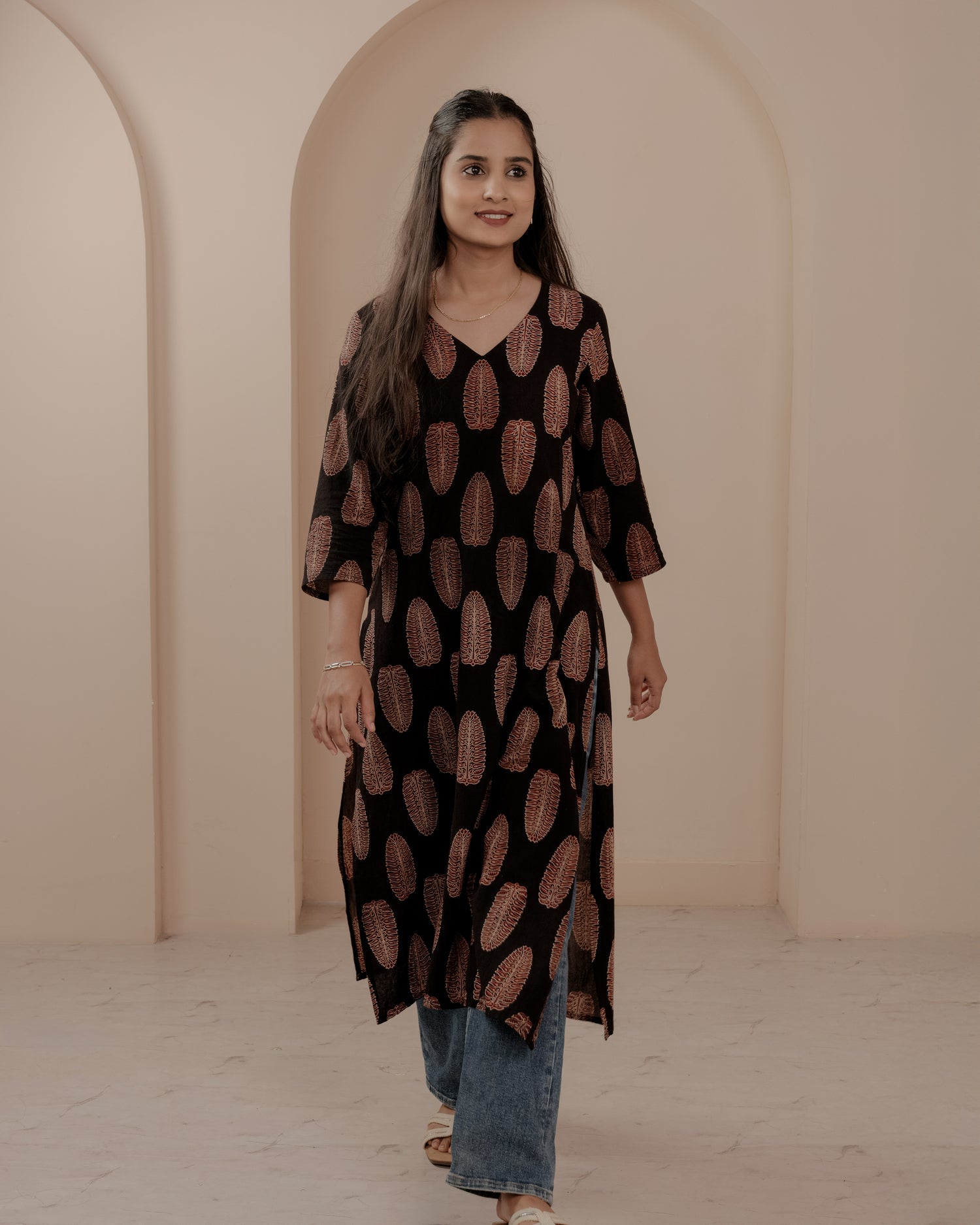 Black Ajrakh Hand Block Printed V-Neck Kurta