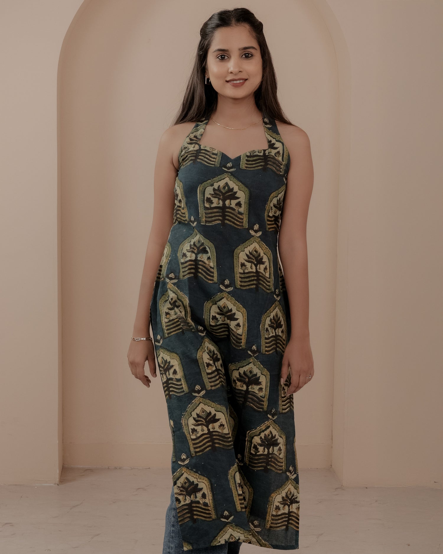 Blue Hand Block Printed Halter Neck Kurti