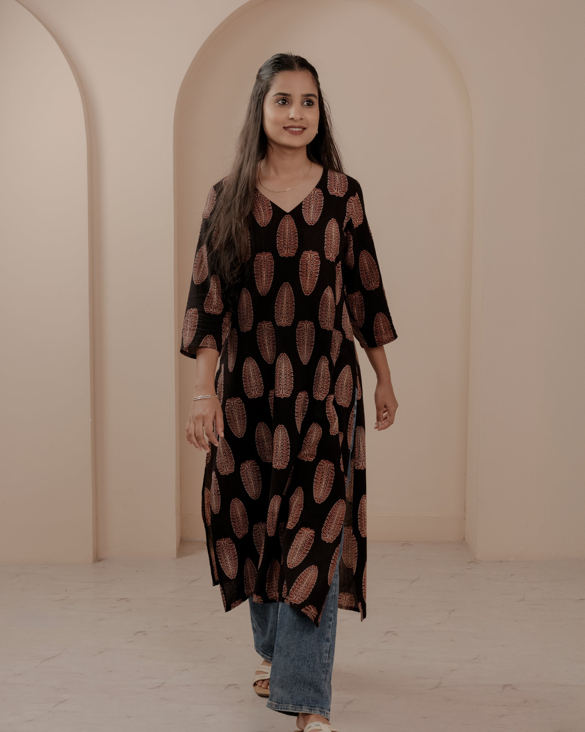 A pure cotton kurta featuring a stylish V-neckline and 3/4th sleeves. Designed in timeless black with traditional Ajrakh hand block prints, this piece offers effortless comfort and elegance - perfect for everyday wear.