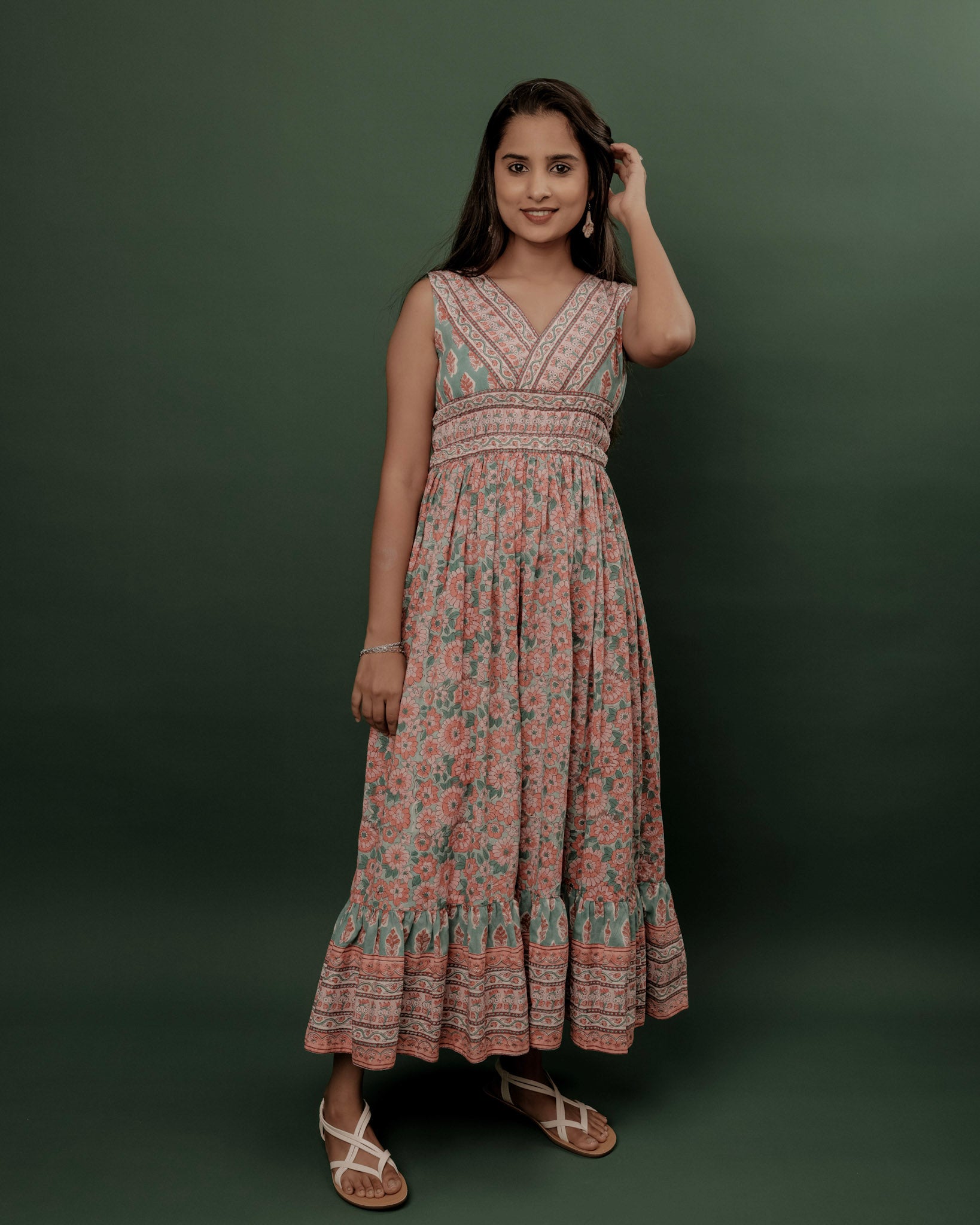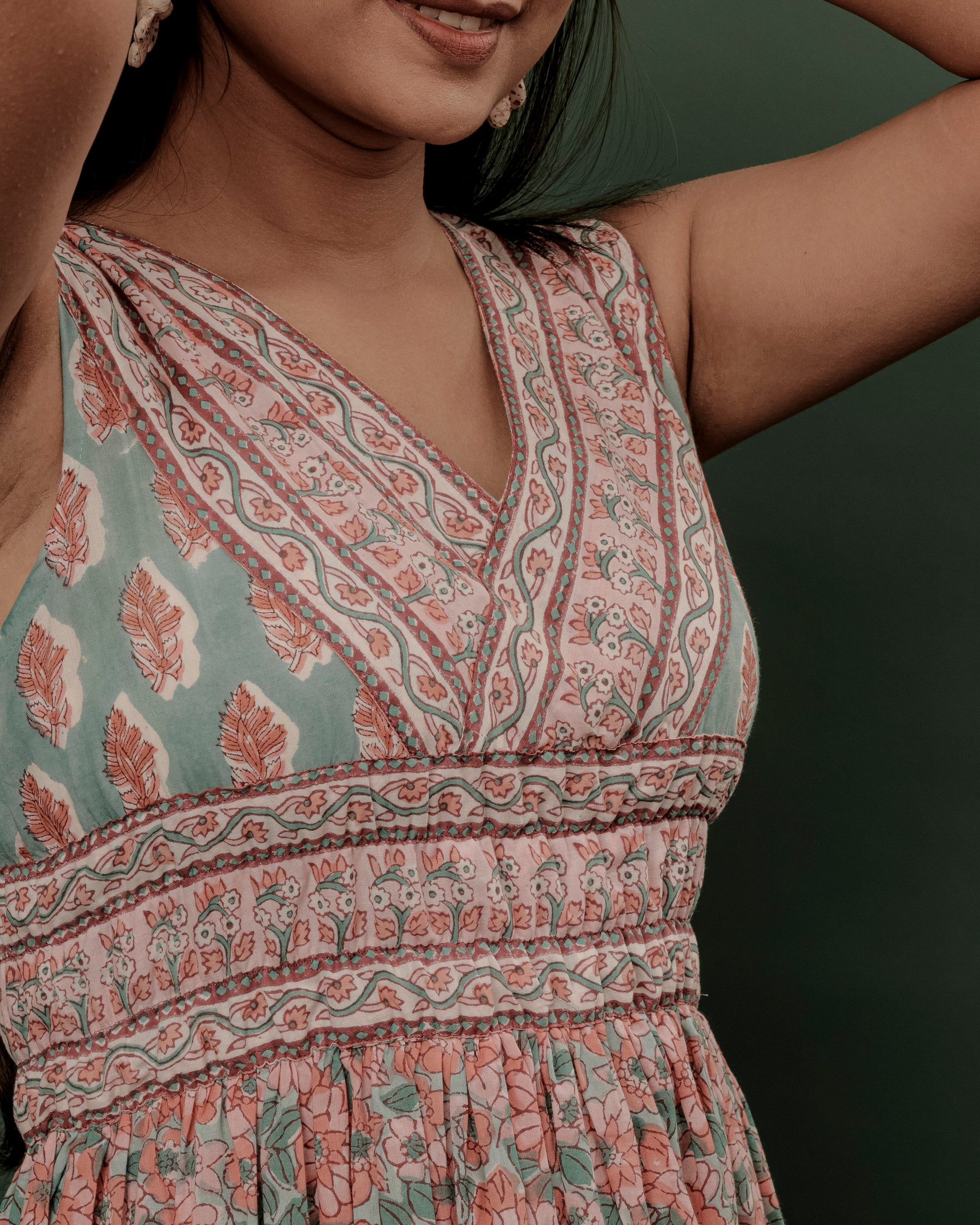 Crafted in soft cotton with delicate Sanganeri hand block prints, this sleeveless frock is designed for effortless charm. The elasticated waist gives a flattering fit, while subtle detailing at the hemline adds a graceful touch. The soothing peach, baby pink, and mint green combination makes it a breezy choice for daytime outings or casual gatherings.